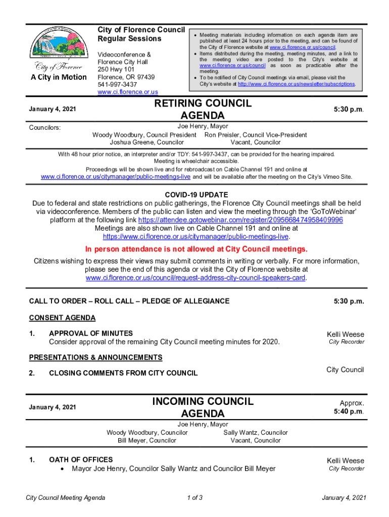 City of Florence Council Regular Sessions Videoconference & Florence City Hall 250 Hwy 101 Florence, OR 97439 5419973437 www.ci.florence.or.usca3\'i YP;;;;Jejune A City in MotionRETIRING COUNCIL AGENDA
