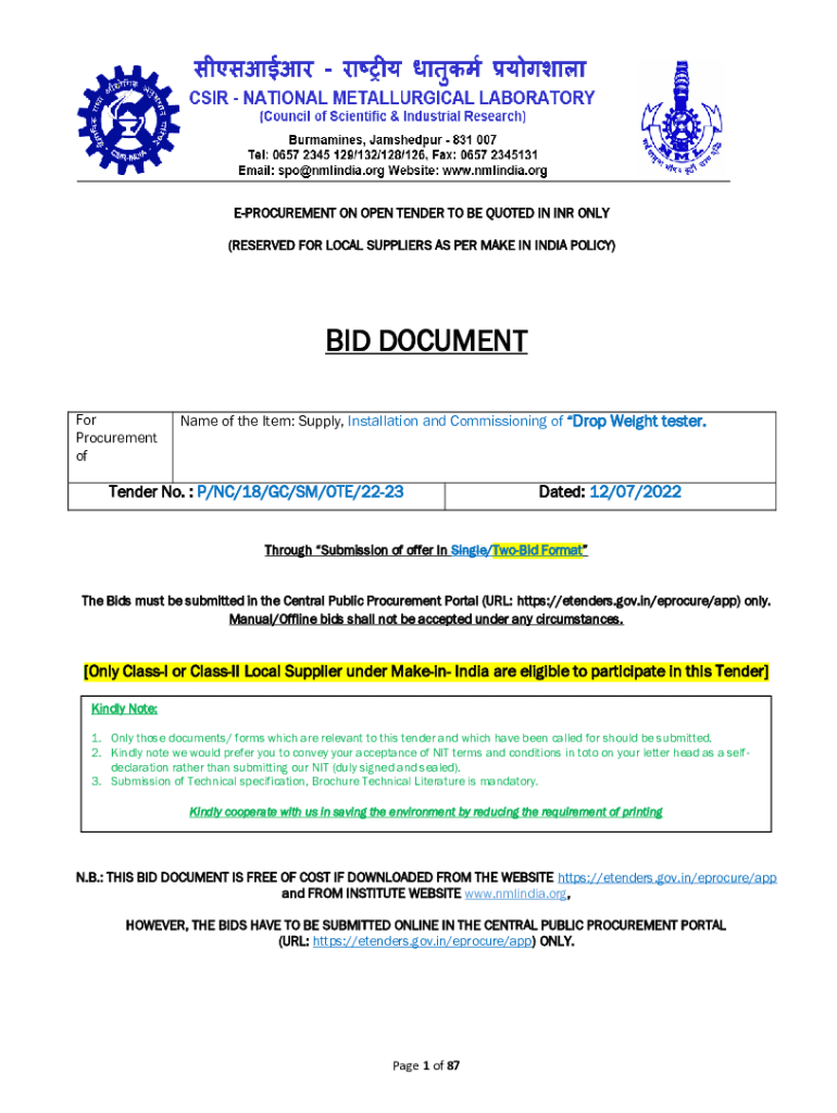 PROCUREMENT ON OPEN TENDER TO BE QUOTED IN INR ONLY (RESERVED FOR LOCAL SUPPLIERS AS PER MAKE IN INDIA POLICY)BID DOCUMENT For Procurement name of the Item: Supply, Installation and Commissioning
