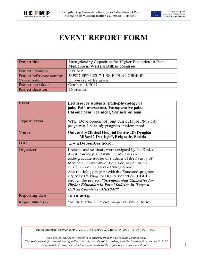 Strengthening Capacities for Higher Education of Pain Medicine in Western Balkan countries HEPMPEVENT REPORT FORM Project title Project acronym Project reference number Coordinator Project start date