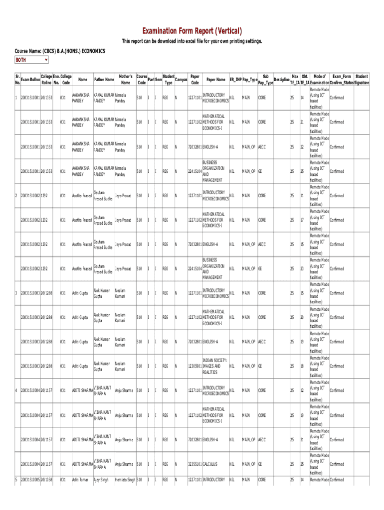 Examination Form Report (Vertical) This report can be downloaded into Excel file for your own printing settings. Course Name: (CBC) B.A.(HONS.) ECONOMICS BOTH Sr. College End. College Exam Roll no