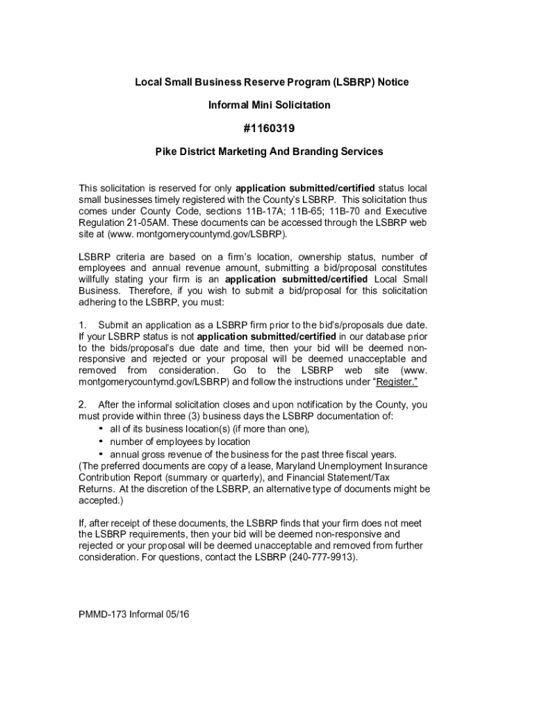 Local Small Business Reserve Program (LS BRP) Notice Informal Mini Solicitation#1160319 Pike District Marketing And Branding Services This solicitation is reserved for only application submitted/certified