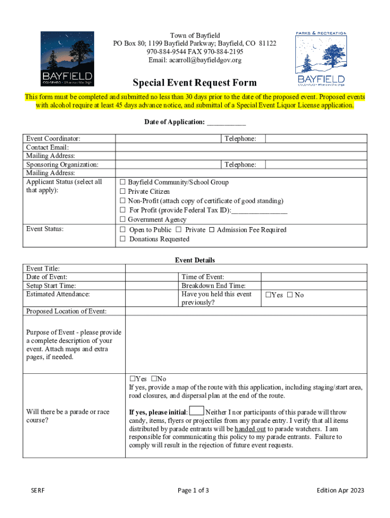 Town of Bay field PO Box 80; 1199 Bay field Parkway; Bay field, CO 81122 9708849544 FAX 9708842195 Email: acarroll@bayfieldgov.orgSpecial Event Request Form This form must be completed and submitted