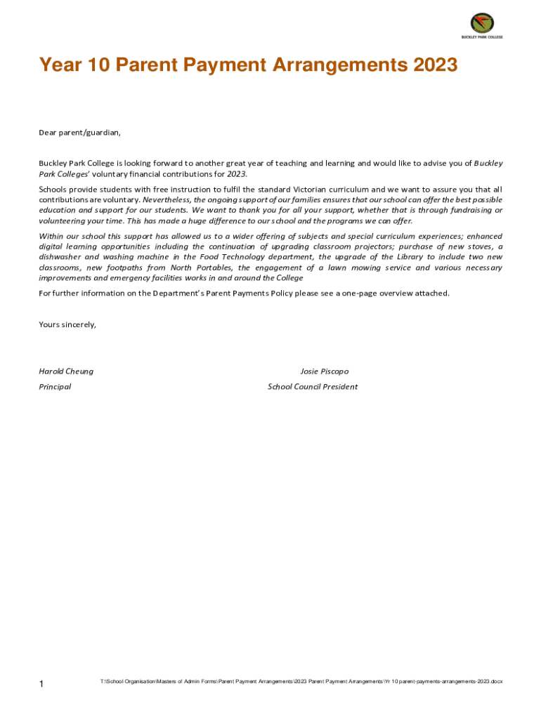 Year 10 Parent Payment Arrangements 2023Dear parent/guardian, Buckley Park College is looking forward to another great year of teaching and learning and would like to advise you of Buckley Park Colleges