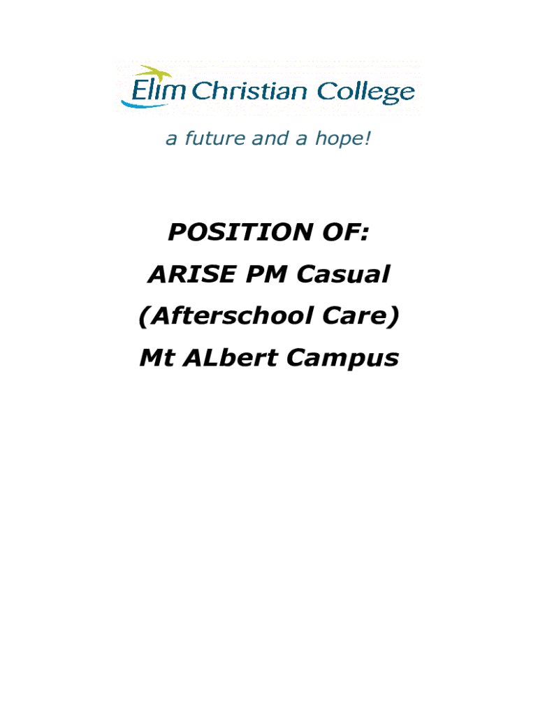 A future and a hope!POSITION OF: ARISE PM Casual (After school Care) Mt Albert Campus April 2018 Dear Applicant Application for ARISE PM Casual (After school Care) Thank you for your expression of