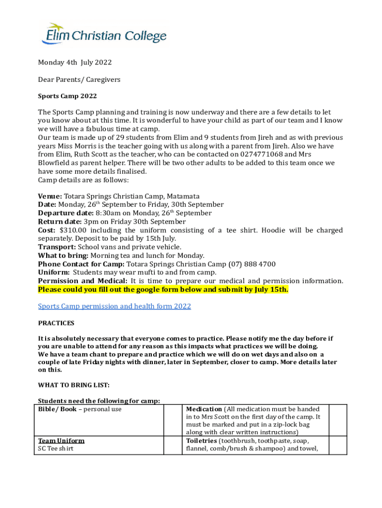Monday 4th July 2022 Dear Parents/ Caregivers Sports Camp 2022The Sports Camp planning and training is now underway and there are a few details to let you know about at this time. It is wonderful