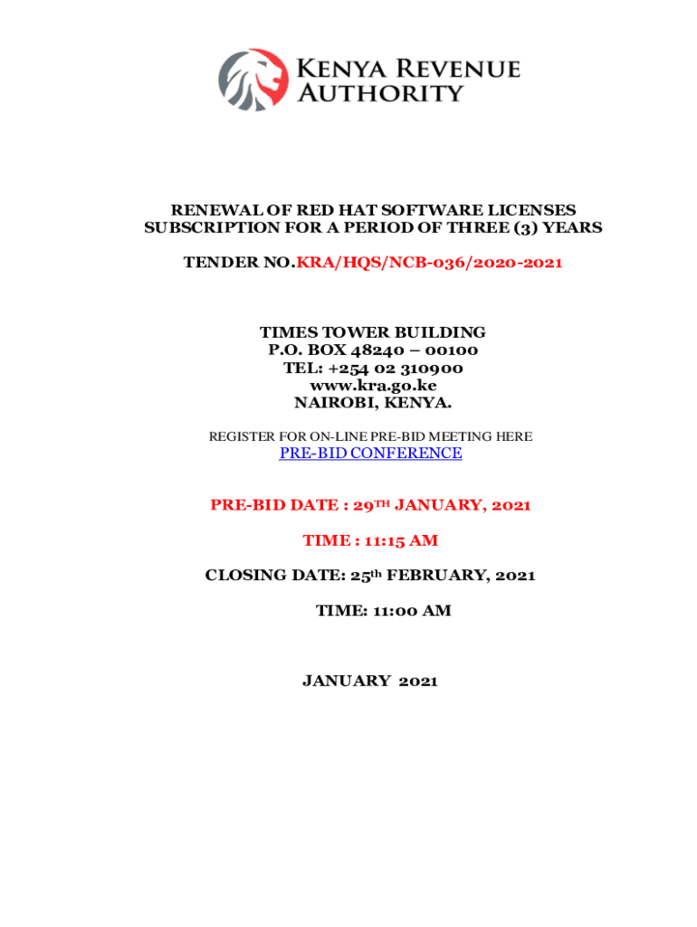 RENEWAL OF RED HAT SOFTWARE LICENSES SUBSCRIPTION FOR A PERIOD OF THREE (3) YEARS TENDER NO.KRA/HQS/NCB036/20202021TIMES TOWER BUILDING P.O. BOX 48240 00100 TEL: +254 02 310900 www.kra.go.ke NAIROBI,