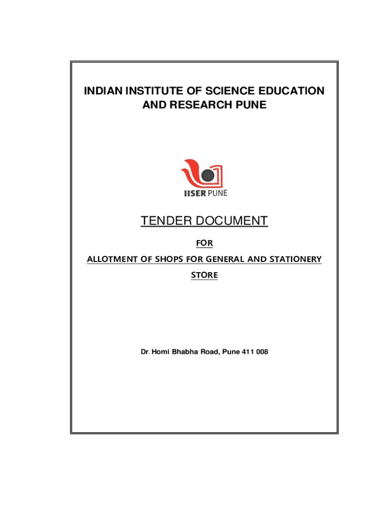 INDIAN INSTITUTE OF SCIENCE EDUCATION AND RESEARCH PRETENDER DOCUMENT FOR ALLOTMENT OF SHOPS FOR GENERAL AND STATIONERY Stored. Home Baha Road, Pune 411 008INDEXSr. No. Particulars Page No.1Tender