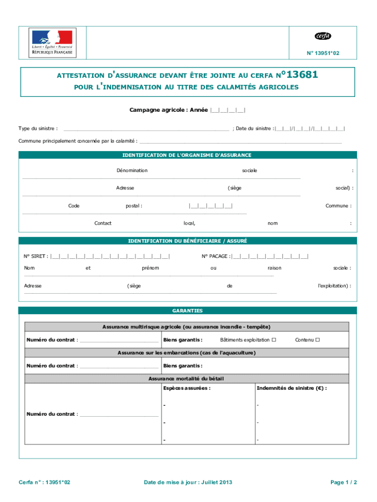 N 13951×02ATTESTATION D\'ASSURANCE LEVANT TRE JOINT EAU CERFA N13681 POUR L\'INDENTATION AU TITLE DES CALAMITY AGRICOLA Champagne Agricola : Anne |__|__|__|__| Type Du sinister :___ ; Date Du sinister