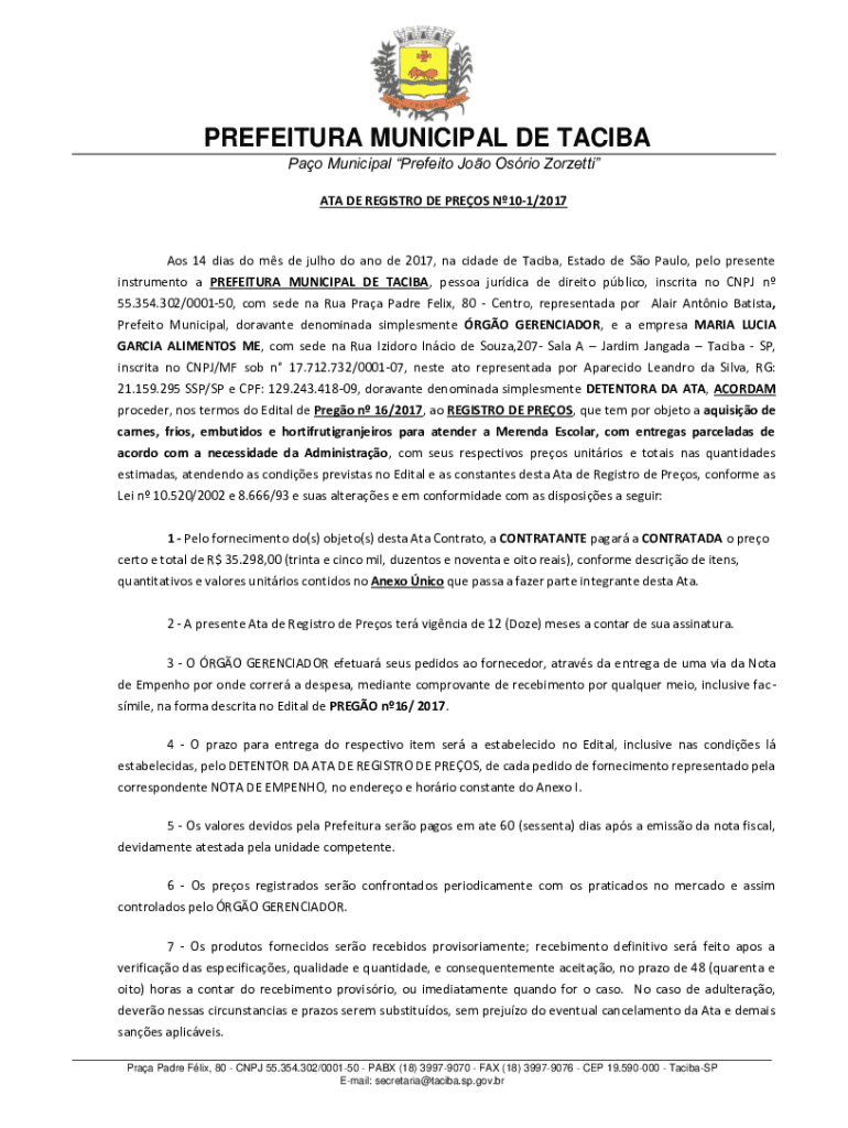 PREFECTURE MUNICIPAL DE TAC IBA PAO Municipal Predator Jew Osorio Corvette ATA DE REGISTRY DE PRESS N101/2017Aos 14 Dias do ms de Julio do an ode 2017, Na MIDADE de Tacoma, Est ado de So Paulo, polo