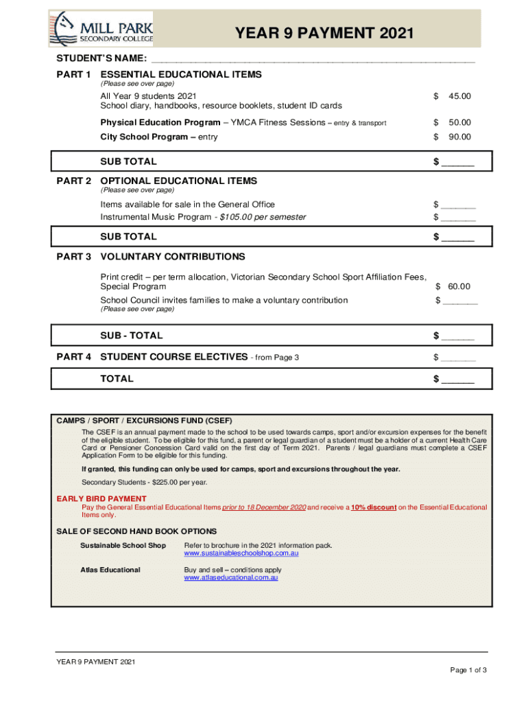 YEAR 9 PAYMENT 2021 STUDENTS NAME: ___ PART 1 ESSENTIAL EDUCATIONAL ITEMS (Please see over page)All Year 9 students 2021 School diary, handbooks, resource booklets, student ID cards$45.00Physical