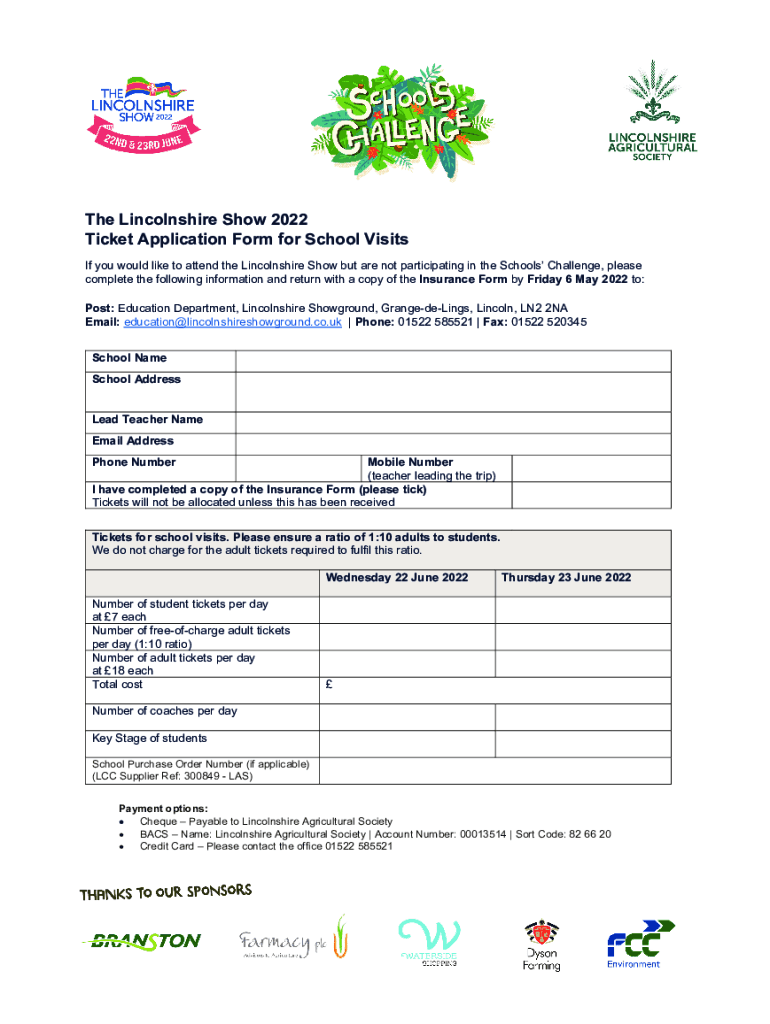 The Lincolnshire Show 2022 Ticket Application Form for School Visits If you would like to attend the Lincolnshire Show but are not participating in the Schools Challenge, please complete the following