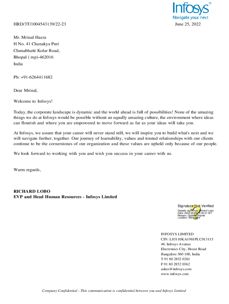 HRD/3T/1004543139/2223June 25, 2022Mr. Urinal Hara H No. 41 Canada Pure Chunabhatti Solar Road, Bhopal (mp)462016 India pH: +916264411682 Dear Urinals, Welcome to Infosys! Today, the corporate landscape