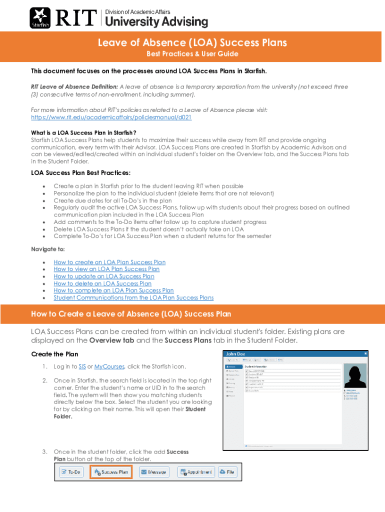 Leave of Absence (LOA) Success Plans Best Practices & User Guides document focuses on the processes around LOA Success Plans in Starfish. IT Leave of Absence Definition: A leave of absence is a temporary