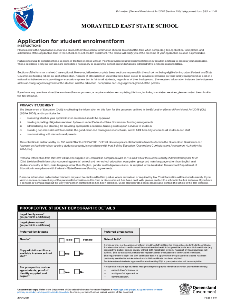Education (General Provisions) Act 2006, Section 155(1) Approved form SEF 1 V8MORAYFIELD EAST STATE SCHOOLApplication for student enrollment form INSTRUCTIONSPlease refer to the Application to enrol
