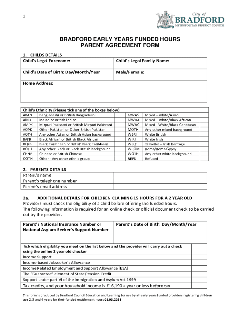 1BRADFORD EARLY YEARS FUNDED HOURS PARENT AGREEMENT FORM 1. CHILD DETAILS Child's Legal Forename:Child's Legal Family Name:Child's Date of Birth: Day/Month/Year Male/Female:Home Address:Child's Ethnicity