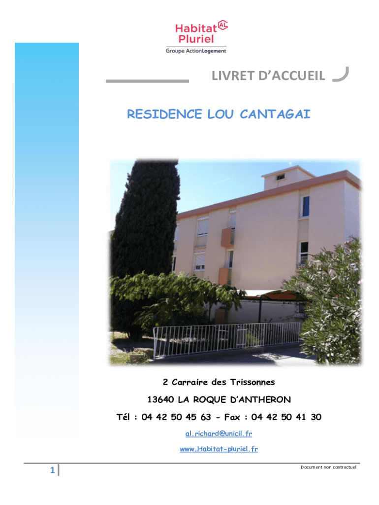 LIVE DACCUEIL RESIDENCE LOU CANTAGAI2 Carrier DES Rissoles 13640 LA ROQUE PANTHEON Tl : 04 42 50 45 63 Fax : 04 42 50 41 30 al.richard@unicil.fr www.Habitatpluriel.fr1Document non contractuelMadame,
