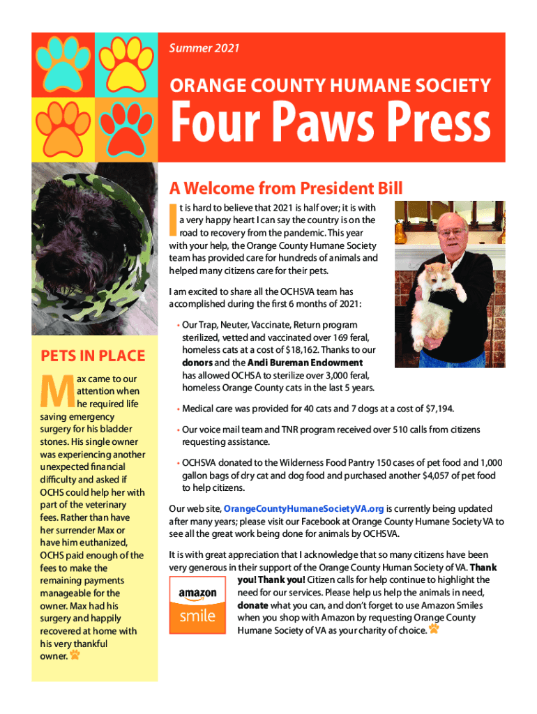 Summer 2021ORANGE COUNTY HUMANE SOCIETYFour Paws Press A Welcome from President Billie is hard to believe that 2021 is half over; it is with a very happy heart I can say the country is on the road