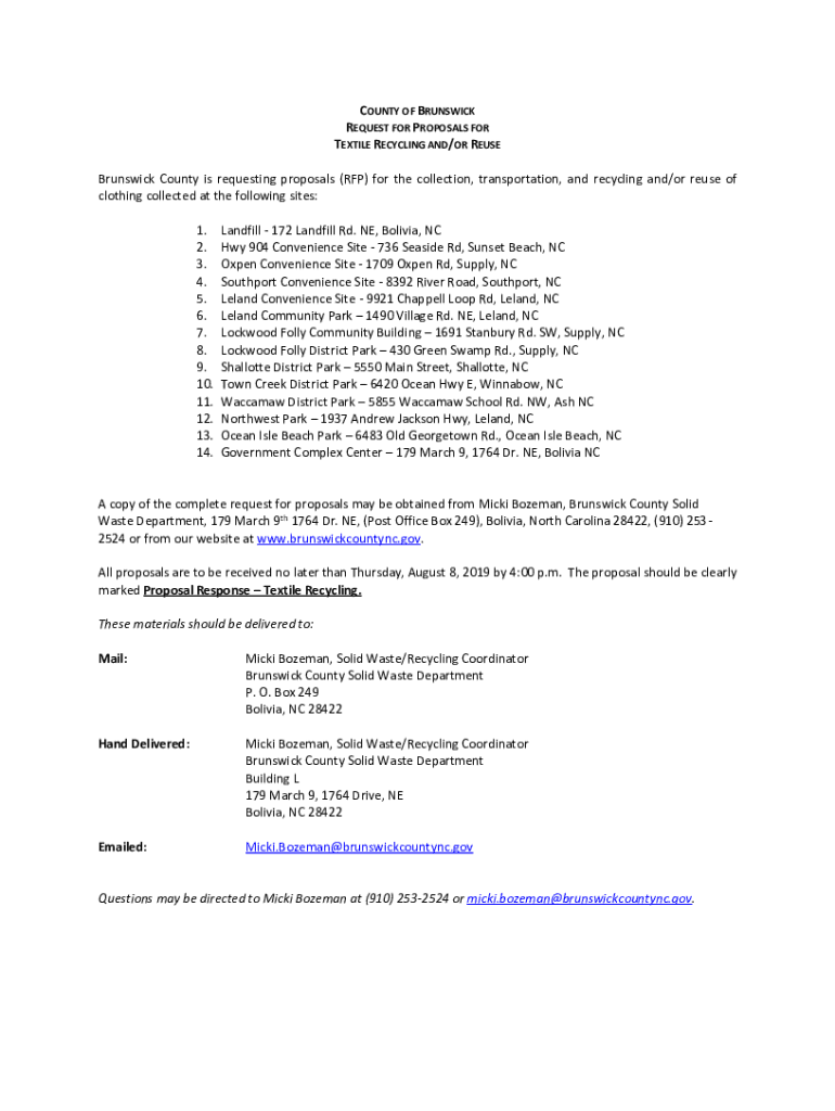 COUNTY OF BRUNSWICK REQUEST FOR PROPOSALS FOR TEXTILE RECYCLING AND/OR REUSE Brunswick County is requesting proposals (RFP) for the collection, transportation, and recycling and/or reuse of clothing