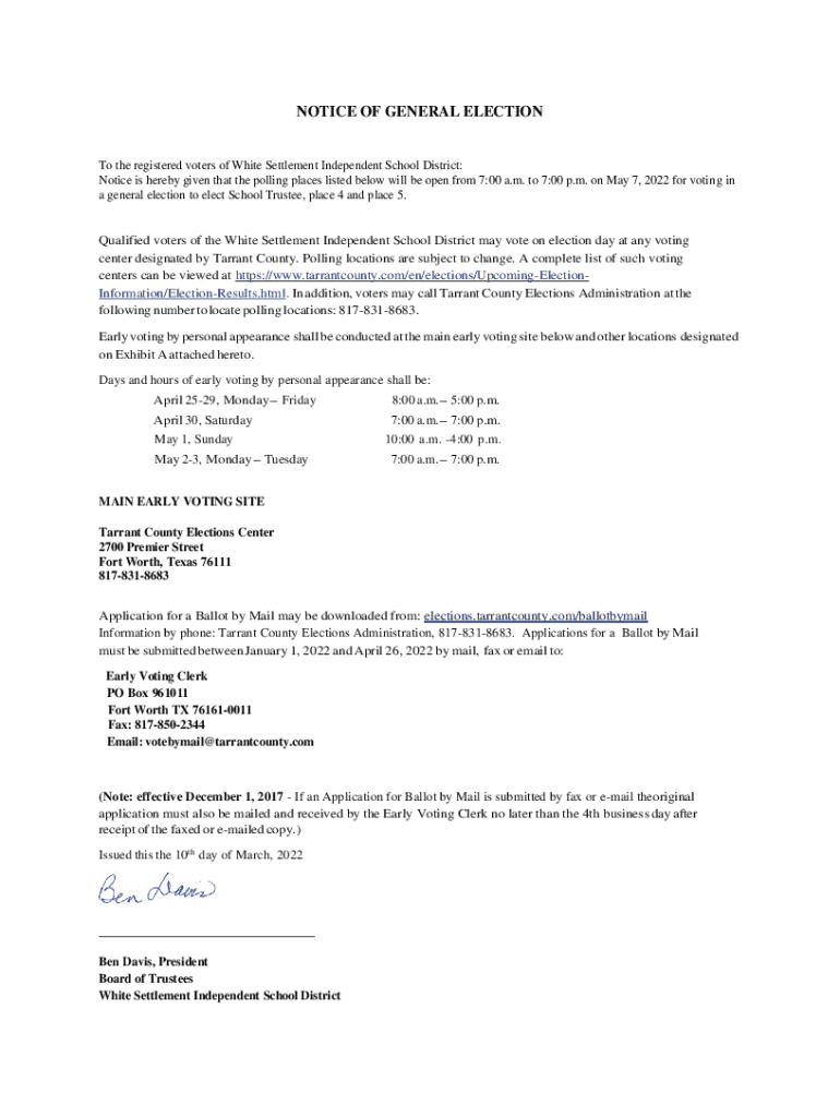 NOTICE OF GENERAL Election the registered voters of White Settlement Independent School District: Notice is hereby given that the polling places listed below will be open from 7:00 a.m. to 7:00 p.m.