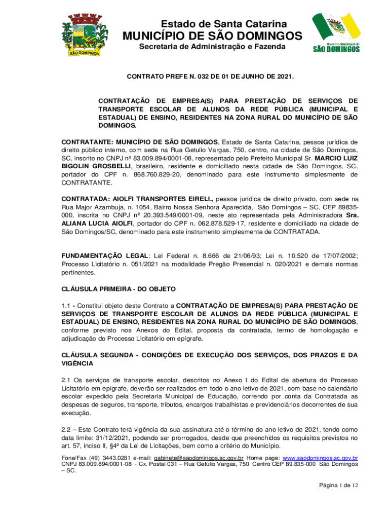 Secretariat de Administrao e FazendaCONTRATO PREFER N. 032 DE 01 DE JUNO DE 2021.CONTRA TAO DE EMPRESS(S) PARA PRESTO DE SERVOS DE
