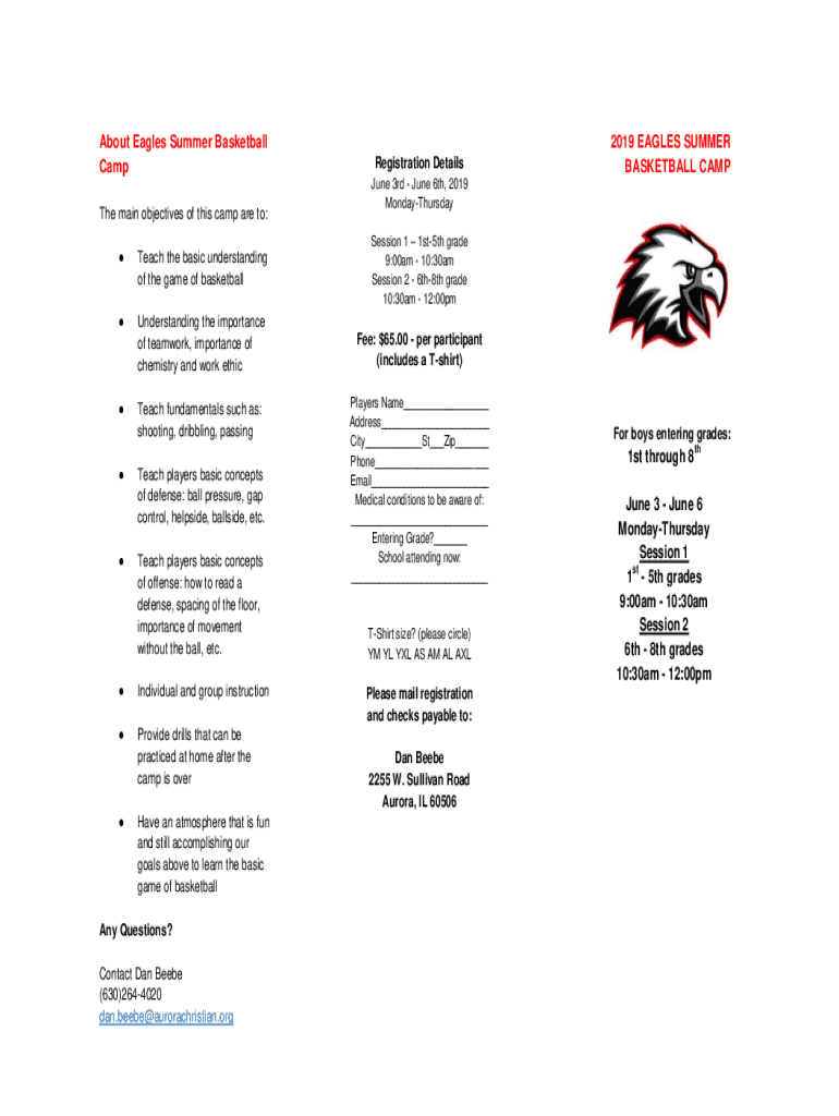 About Eagles Summer Basketball Camp The main objectives of this camp are to:Registration Details June 3rd June 6th, 2019 MondayThursdayTeach the basic understanding of the game of basketballSession