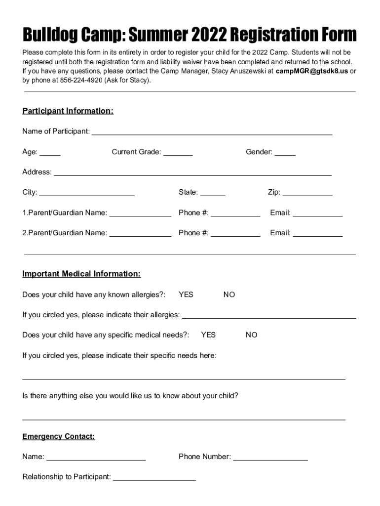 Bulldog Camp: Summer 2022 Registration Form Please complete this form in its entirety in order to register your child for the 2022 Camp. Students will not be registered until both the registration