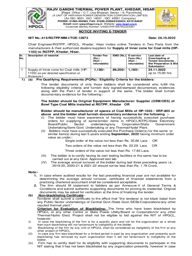 (A UNIT OF HARYANA POWER GENERATION CORPORATION LIMITED)(An ISO: 9001, ISO: 14001, ISO: 45001 Company)HPGCLPHONE: