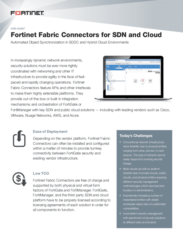 Get the free Fortinet Fabric Connectors for SDN and Cloud Data Sheet. Automated Object Synchroniz...