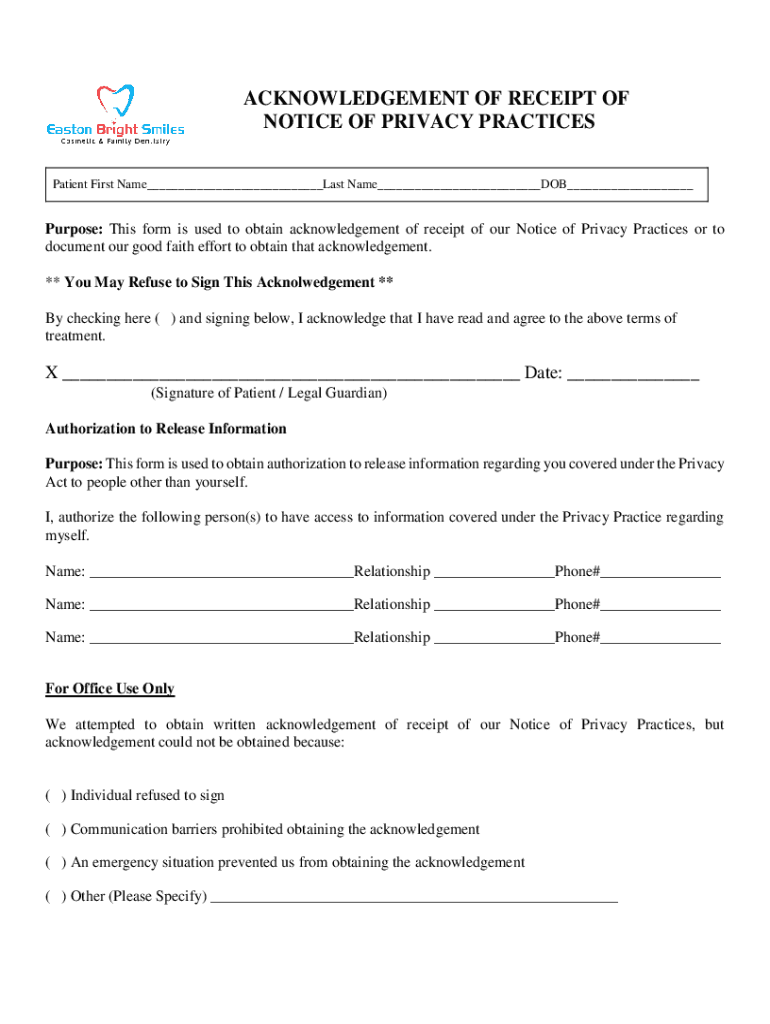ACKNOWLEDGEMENT OF RECEIPT OF NOTICE OF PRIVACY PRACTICES Patient First Name___Last Name___DOB___Purpose: This form is used to obtain acknowledgement of receipt of our Notice of Privacy Practices