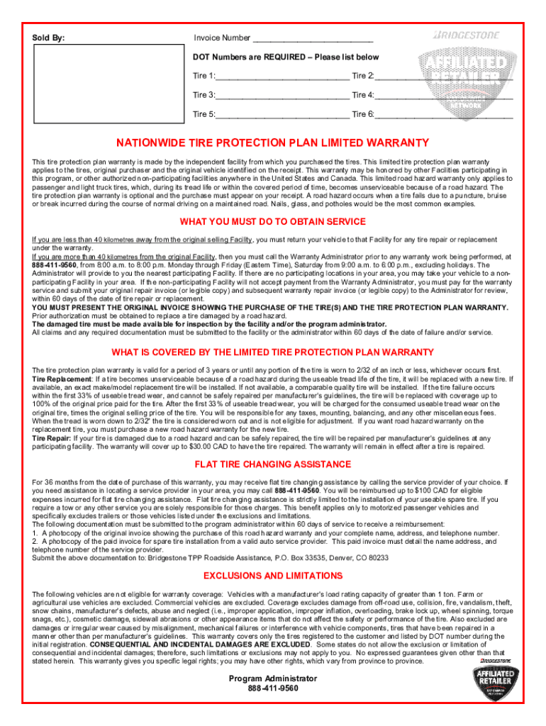 Sold By:Invoice Number ___ DOT Numbers are REQUIRED Please list below Tire 1:___ Tire 2:___ Tire 3:___ Tire 4:___ Tire 5:___ Tire 6:___NATIONWIDE TIRE PROTECTION PLAN LIMITED WARRANTY This tire protection