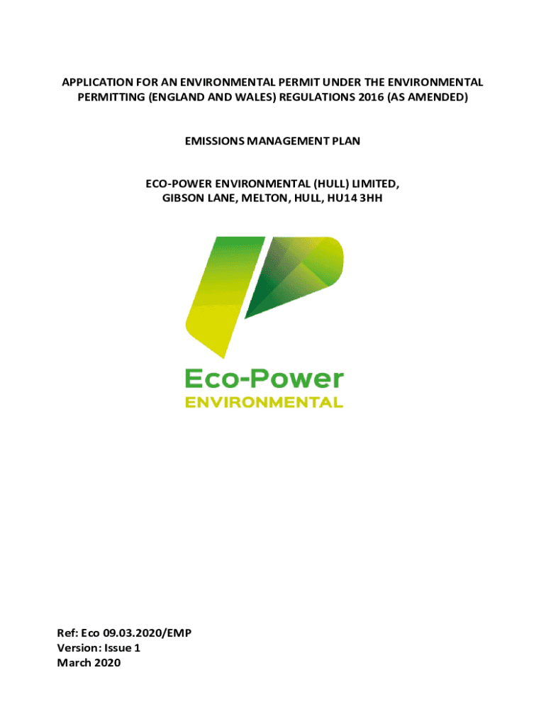 APPLICATION FOR AN ENVIRONMENTAL PERMIT UNDER THE ENVIRONMENTAL PERMITTING (ENGLAND AND WALES) REGULATIONS 2016 (AS AMENDED) EMISSIONS MANAGEMENT PLAN EMPOWER ENVIRONMENTAL (HULL) LIMITED, GIBSON