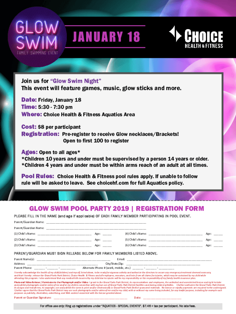 JA N U A R Y 1 8Join us for Glow Swim Night This event will feature games, music, glow sticks and more. Date: Friday, January 18 Time: 5:30 7:30 pm Where: Choice Health & Fitness Aquatics Area Cost: