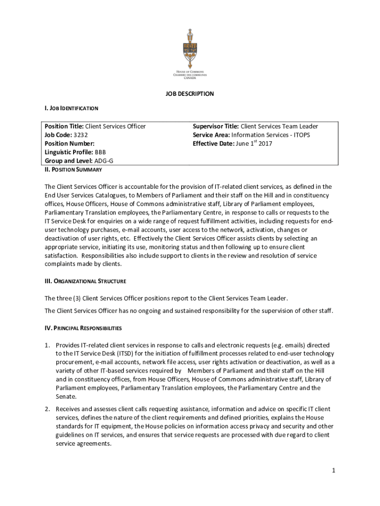 JOB DESCRIPTION. JOB IDENTIFICATION Position Title: Client Services Officer Job Code: 3232 Position Number: Linguistic Profile: BBB Group and Level: ADG II. POSITION SUMMARYSupervisor Title: Client