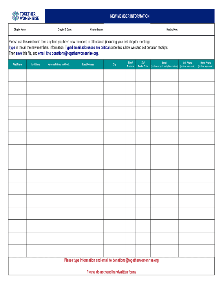 Chapter Name:Chapter ID Code:Chapter Leader:Meeting Date:Please use this electronic form any time you have new members in attendance (including your first chapter meeting).