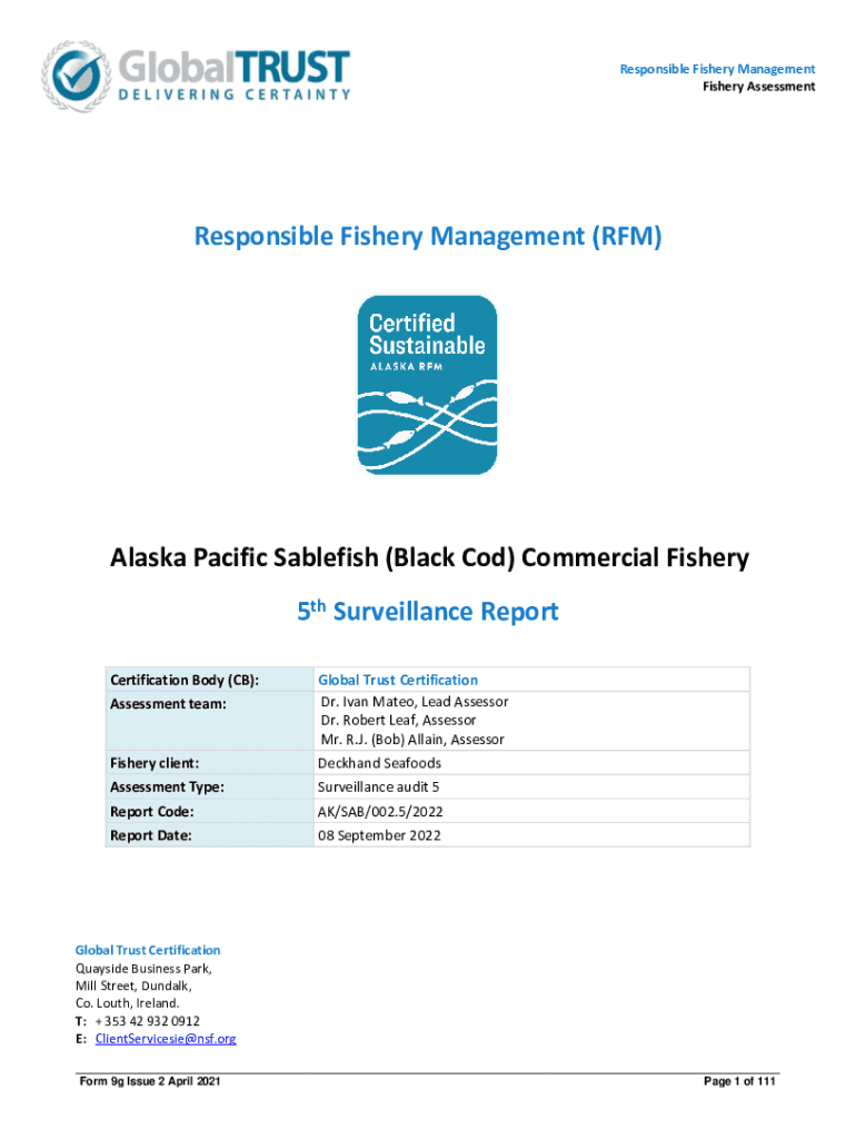 Responsible Fishery Management Fishery AssessmentResponsible Fishery Management (RFM)Alaska Pacific Sable fish (Black Cod) Commercial Fishery 5th Surveillance Report Certification Body (CB):Fishery