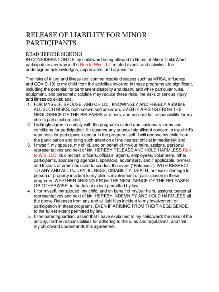 RELEASE OF LIABILITY FOR MINOR PARTICIPANTS READ BEFORE SIGNING IN CONSIDERATION OF my child/ward being allowed to Name of Minor Child/Ward participate in any way in the Run to Win, LLC related events