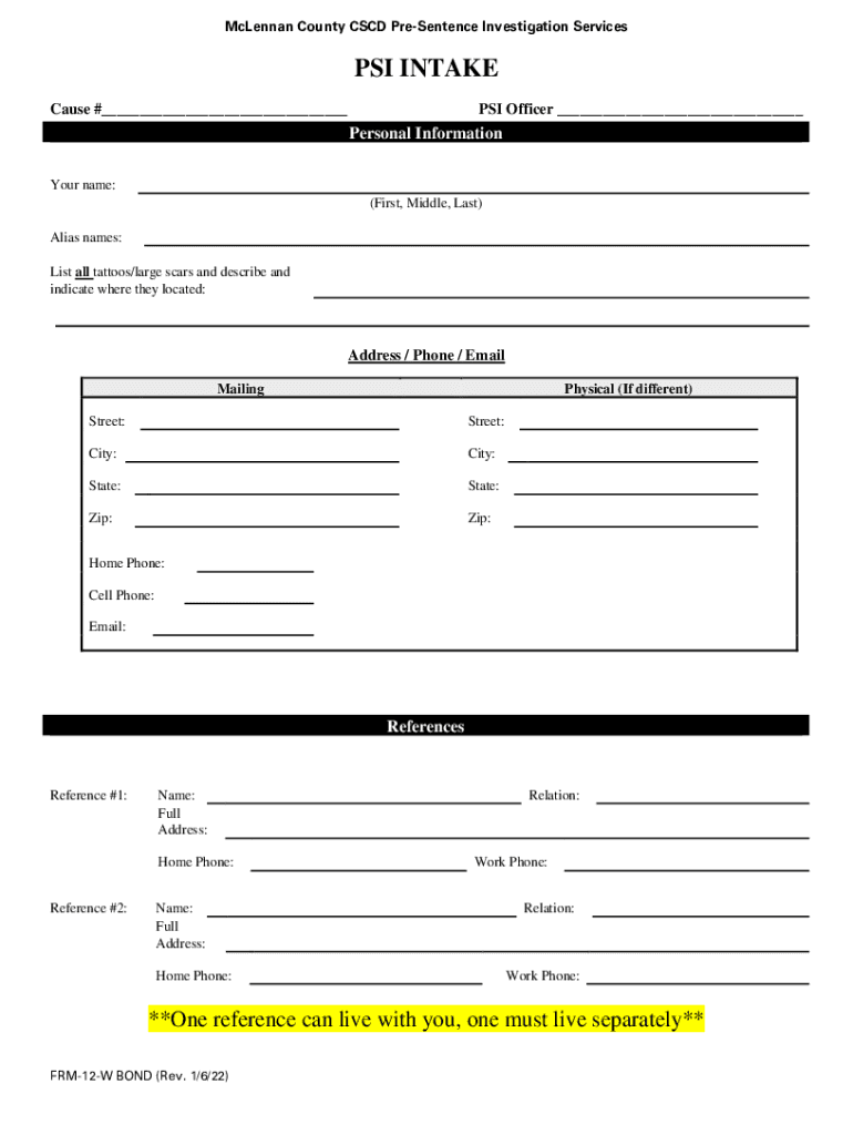 Get the free Form 12-W BOND PSI-Questionnaire (PDF) - McLennan County