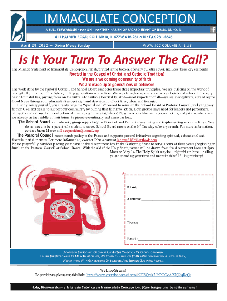 IMMACULATE CONCEPTION A FULL STEWARDSHIP PARISH PARTNER PARISH OF SACRED HEART OF JESUS, DUO, IL411 PALMER ROAD, COLUMBIA, IL 62236 6182815105 FAX 2816848 April 24, 2022, Divine Mercy Sunday WWW.ICCCOLUMBIAIL.