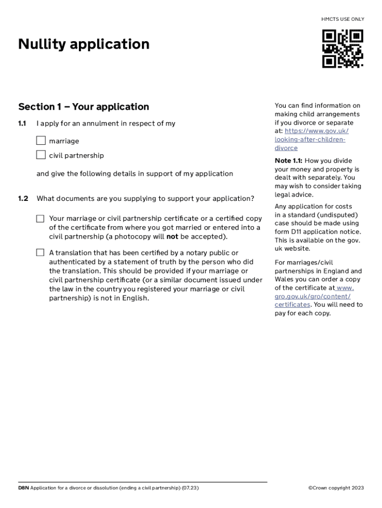 MCTS USE ONLYNullity applicationSection 1 Your application 1.1I apply for an annulment in respect of my marriage civil partnership and give the following details in support of my application1.2What