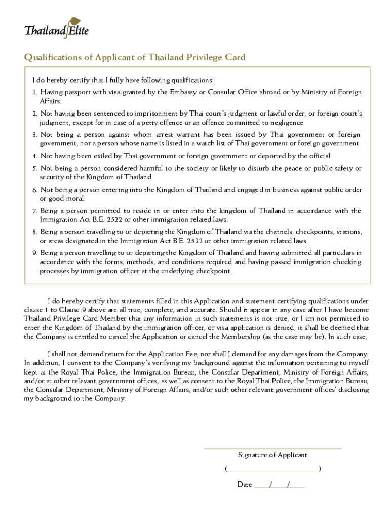 Qualifications of Applicant of Thailand Privilege Card I do hereby certify that I fully have following qualifications: 1. Having passport with visa granted by the Embassy or Consular Office abroad