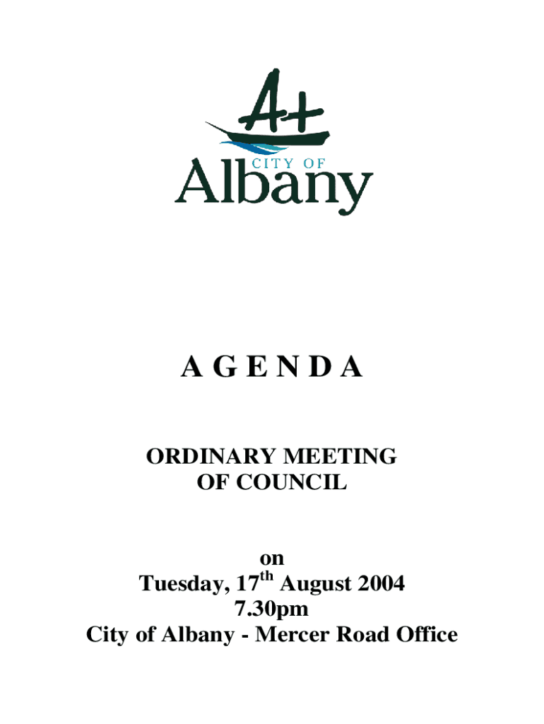 AGENDA ORDINARY MEETING OF COUNCIL on Tuesday, 17th August 2004 7.30pm City of Albany Mercer Road OfficeCity of Albany ** Disclaimer ** No responsibility whatsoever is implied or accepted by the City