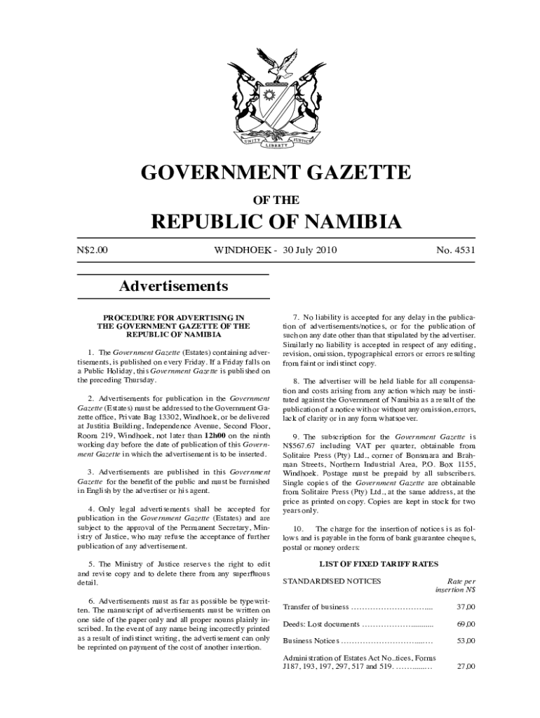 GOVERNMENT GAZETTE OF REPUBLIC OF NAMIBIA N$2.00WINDHOEK 30 July 2010No. 4531Advertisements PROCEDURE FOR ADVERTISING IN THE GOVERNMENT GAZETTE OF THE REPUBLIC OF NAMIBIA1. The Government Gazette