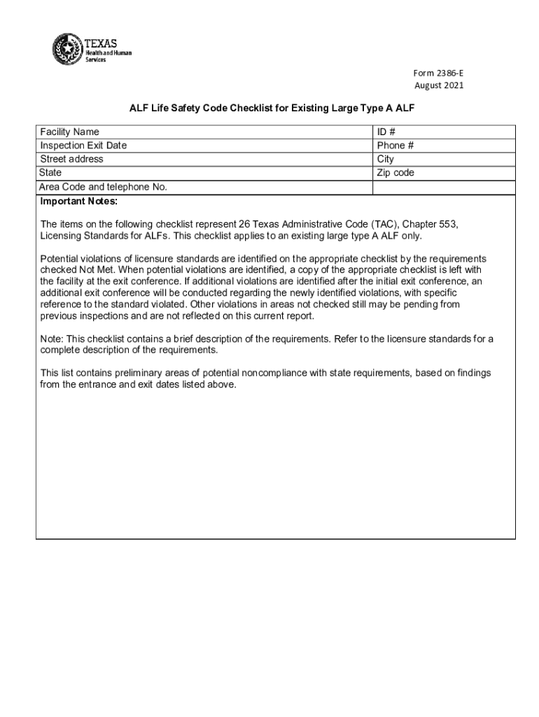 Form 2386E August 2021 ALF Life Safety Code Checklist for Existing Large Type A ALF Facility Name Inspection Exit Date Street address State Area Code and telephone No. Important Notes:ID # Phone #