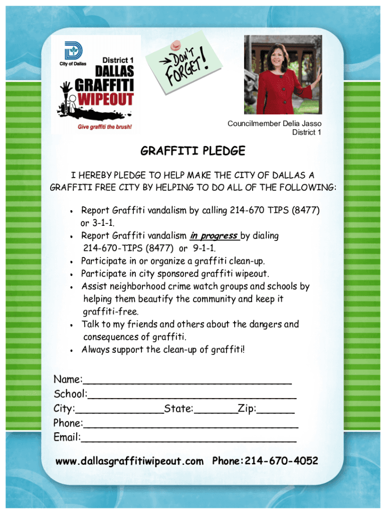 Council member Delia Basso District 1GRAFFITI PLEDGE I HEREBY PLEDGE TO HELP MAKE THE CITY OF DALLAS A GRAFFITI FREE CITY BY HELPING TO DO All the FOLLOWING:Report Graffiti vandalism by calling 214670