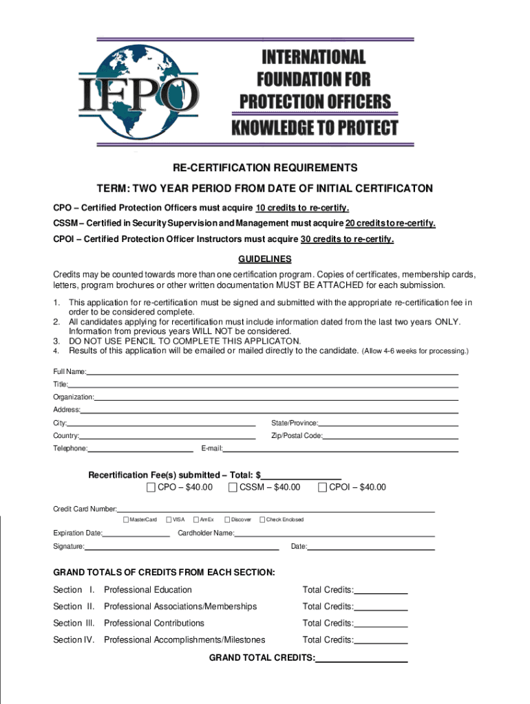RECERTIFICATION REQUIREMENTS TERM: TWO-YEAR PERIOD FROM DATE OF INITIAL CERTIFICATION CPO Certified Protection Officers must acquire 10 credits to recertify. CSS Certified in Security Supervision