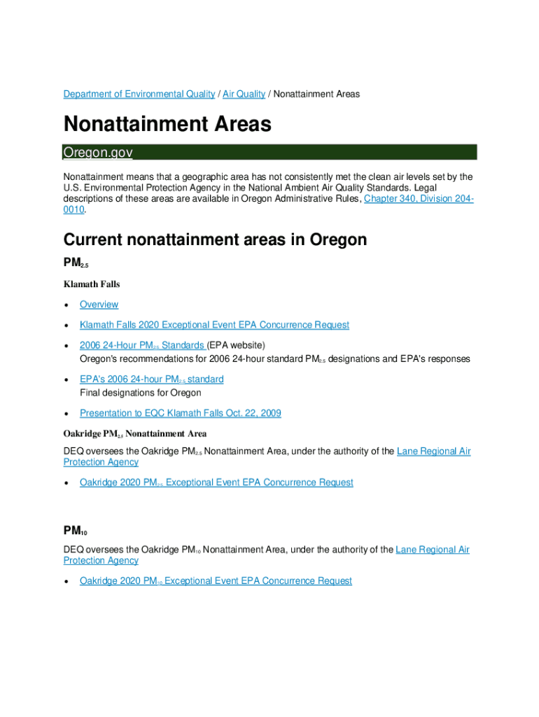 Department of Environmental Quality / Air Quality / Nonattainment AreasNonattainment Areas Oregon.gov Nonattainment means that a geographic area has not consistently met the clean air levels set by