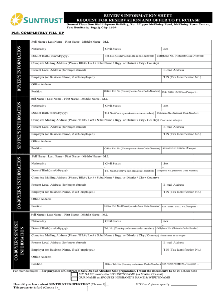 Get the free buyer's information sheet b uye r's in f o rmat io n s p o us e ...