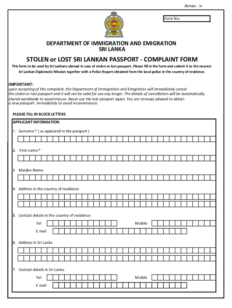 Annex inform No:DEPARTMENT OF IMMIGRATION AND EMIGRATION SRI LANKASTOLEN or LOST SRI LANKAN PASSPORT COMPLAINT From This form to be used by Sri Lankan abroad in case of stolen or lost passport. Please