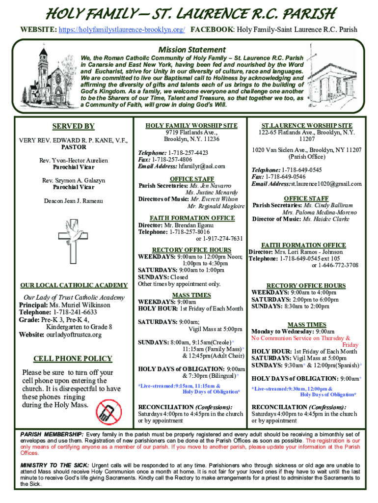 HOLY FAMILY ST. LAURENCE R.C. PARISH WEBSITE: https://holyfamilystlaurencebrooklyn.org/ FACEBOOK: Holy FamilySaint Laurence R.C. ParishMission Statement, the Roman Catholic Community of Holy Family