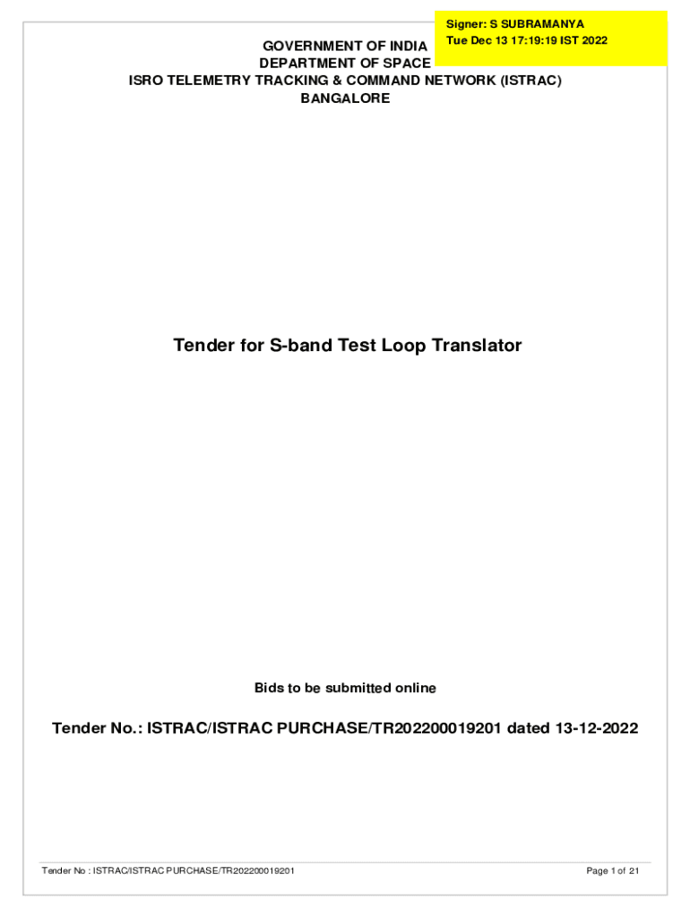 Signer: S SUBRAHMANYAM Tue Dec 13 17:19:19 IST 2022GOVERNMENT OF INDIA DEPARTMENT OF SPACE ISRO TELEMETRY TRACKING & COMMAND NETWORK (IST RAC) BANGALORETender for Band Test Loop Translators to be